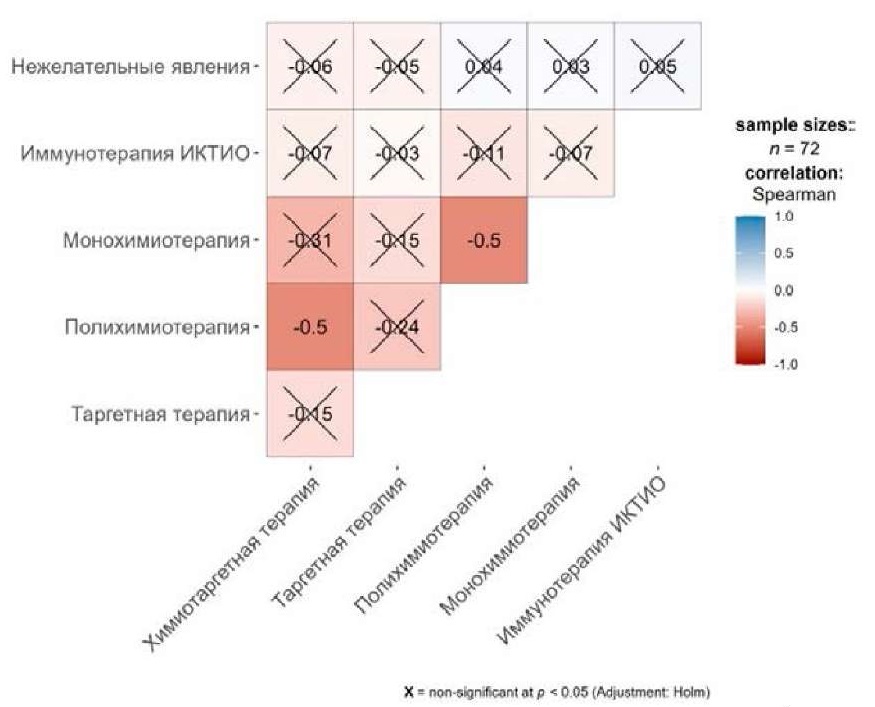 Статистический анализ проводился с использованием языка программирования R и программы IBMR SPSSR Statistics 26,0. Категориальные переменные представлены в абсолютных и относительных числах, сравнение проведено с помощью критерия χ2-Пирсона с применением поправки Йейтса при количестве наблюдений от пяти до десяти, а также точного критерия Фишера в случае количества наблюдений менее пяти. Для категориальных переменных рассчитано значение отношения шансов с 95 % доверительным интервалом (OШ (95 % ДИ)). Количественные переменные представлены в виде медианы и интерквартильного размаха (Me (Q1; Q3)). Данные проанализированы на соответствие нормальному распределению (критерий Колмогорова — Смирнова). В связи с несоответствием данных нормальному распределению, анализ проводился с использованием непараметрического теста Манна — Уитни. Статистически значимыми считались различия при p < 0,05. Корреляционные взаимосвязи были исследованы с использованием критерия Спирмана с поправкой Холма на множественные сравнения. В приведенных результатах указано значение Спирмана, а также уровень значимости связи. Оценка силы связи проведена в соответствии со шкалой Чеддока. В ходе работы были сформированы 2 группы исследования в зависимости от назначенной терапии. Нами были определены группы пациентов с терапией, назначенной в соответствии с зарегистрированными показаниями (группа 1), а также пациентов, получавших терапию вне зарегистрированных показаний (группа 2).