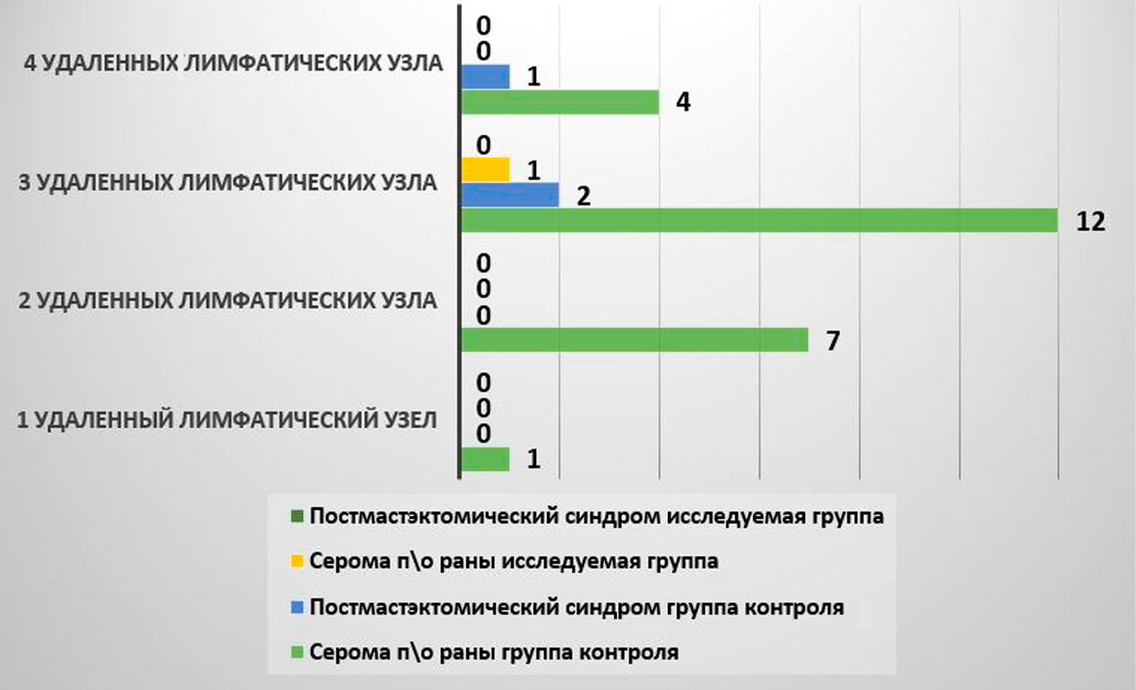 В отдаленном периоде в группе D выявлен 1 случай развития лимфедемы верхней конечности 1 ст. В группе исследования отмечалось значительное снижение количества послеоперационных сером. Необходимость проведения пункционной эвакуации возникла в 1 случае в группе F, что составляет 3,5 % от общего числа группы и 5,8 % от числа пациенток группы F. При сравнении с эквивалентными по количеству удаленных лимфатических узлов группами контроля (группы B и С) инструментом хи-квадрат различия признаны статистически значимыми (p = 0,0475). При этом повторные манипуляции в исследуемой группе не потребовались. Признаки развития постмастэктомического синдрома отсутствовали (рис. 2).