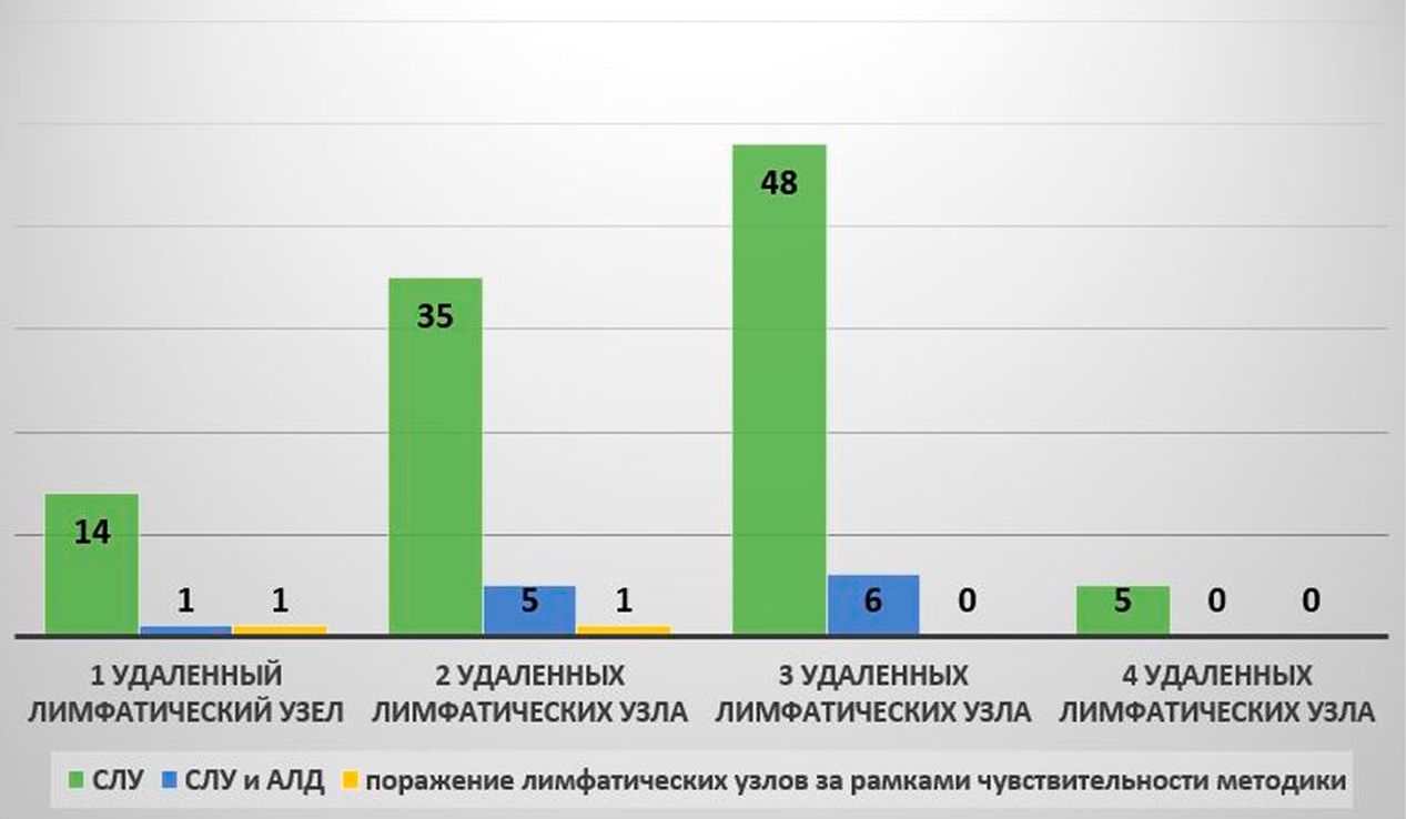 При разделении пациенток на подгруппы в зависимости от количества пораженных лимфатических узлов во время выполнении БСЛУ выявлены случаи метастатического поражения большего количества коллекторов, чем существующая разрешающая способность метода. Чувствительность методики зависела от количества первично резецированных лимфатических узлов.