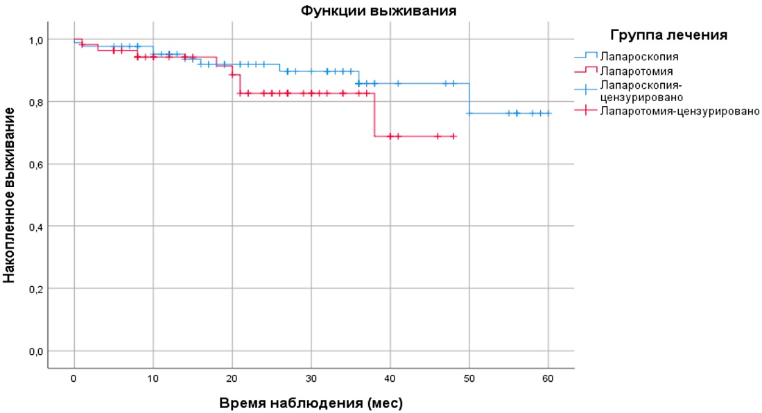 Проведенный анализ общей выживаемости, частоты летальных исходов и рецидивов/прогрессирования заболевания показал сопоставимость результатов между лапаротомной и лапароскопической группами (табл. 8).
