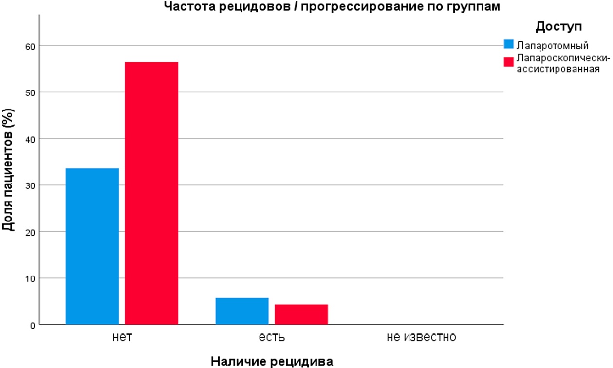 Частота возврата заболеваний в виде (рецидивов и метастазов) прогрессирования заболевания в лапаротомной группе составила 25,5 %, в лапароскопической — 21,2 % (p = 0,681), также без достоверных различий (рис. 5).