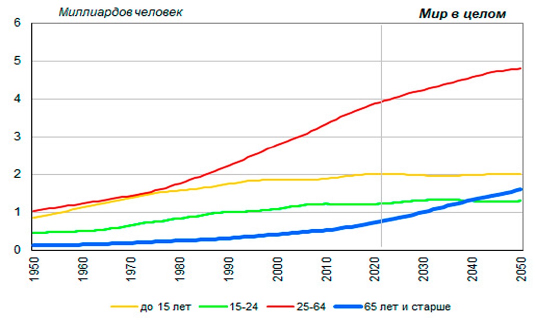 Рисунок 1. Численность населения мира по основным возрастным группам, 1950–2050 годы*, миллиардов человек