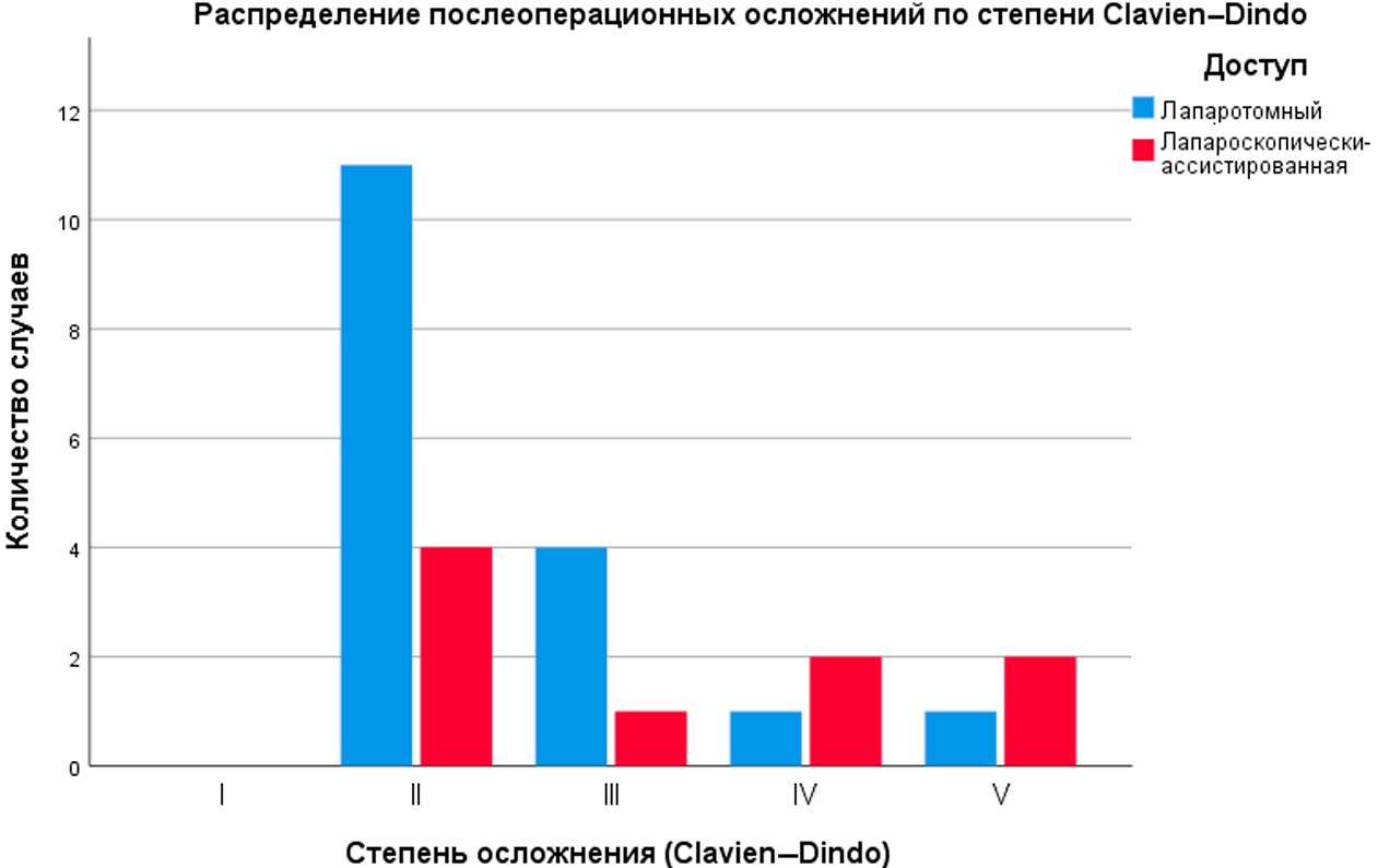 При анализе частоты послеоперационных осложнений по классификации Clavien—Dindo между группами лапаротомии и лапароскопии статистически значимое различие было выявлено только для осложнений II степени, которые чаще наблюдались в лапаротомной группе (20,0 % против 4,7 %, p = 0,009). Осложнения более высокой степени (III–V) встречались с сопоставимой частотой и не показали статистически значимых различий (p > 0,05) (табл. 7, рис. 3).